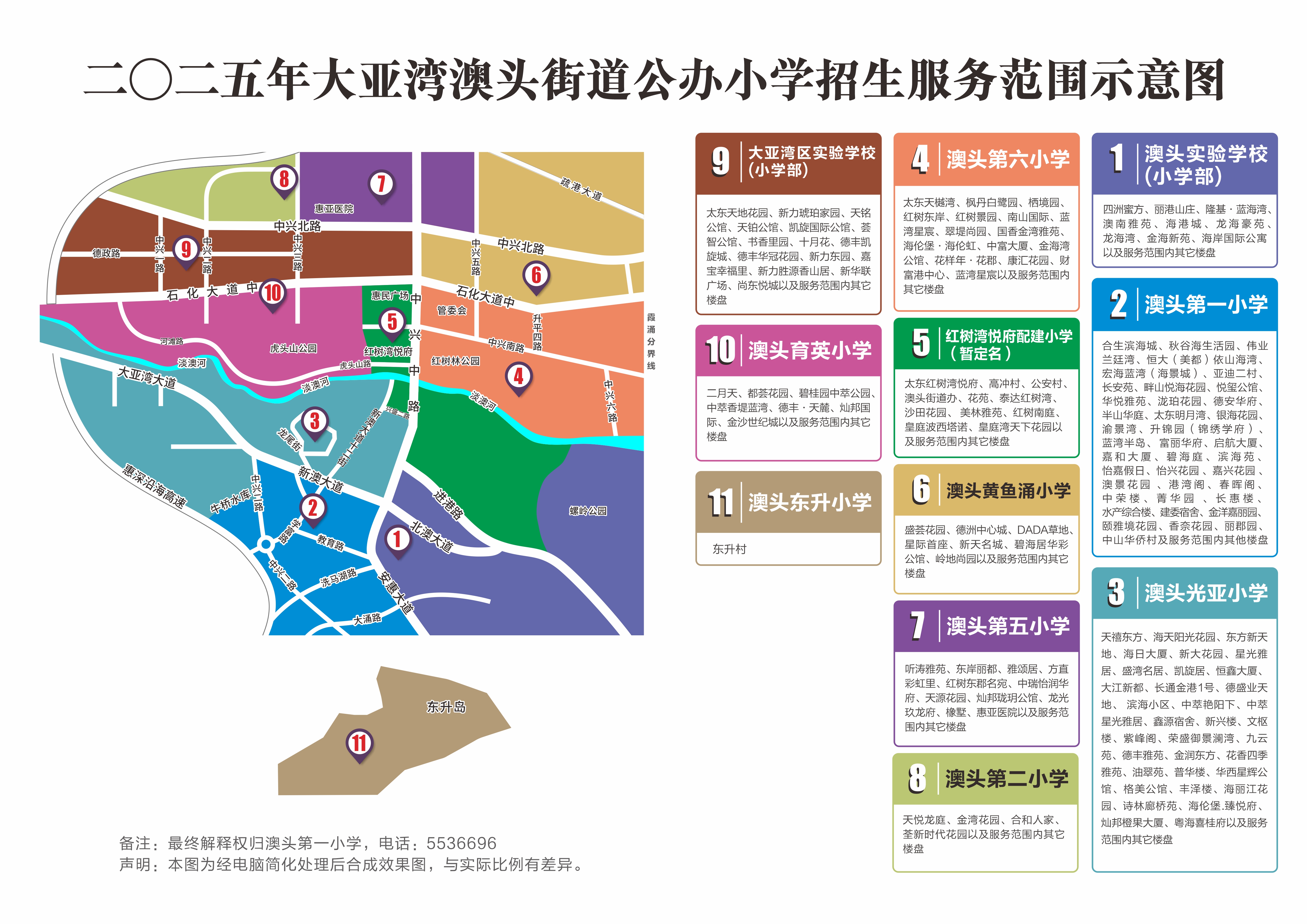 ?、诎念^中心區(qū)大學(xué)區(qū)(含澳頭第二小學(xué)、育英小學(xué)、澳頭第五小學(xué)、大亞灣區(qū)實驗學(xué)校小學(xué)部和黃魚涌小學(xué)5所學(xué)校招生區(qū)域)。