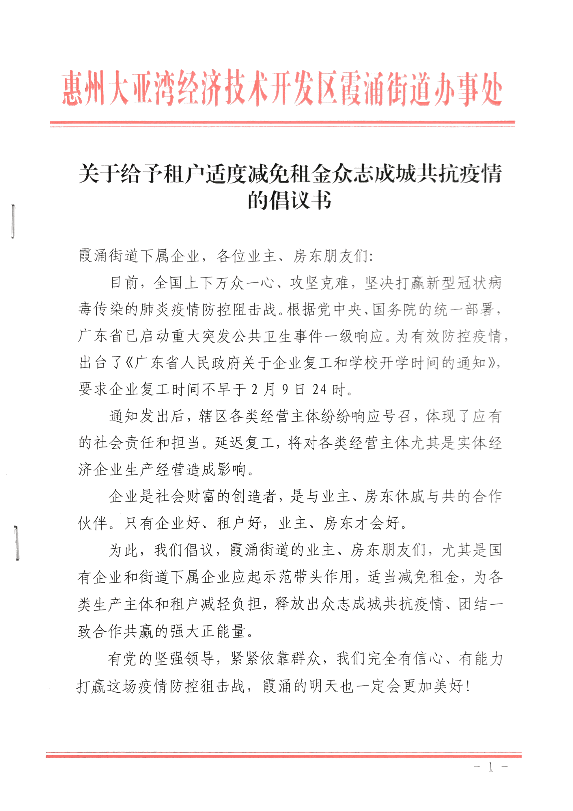 關(guān)于給予租戶適度減免租金眾志成城共抗疫情的倡議書