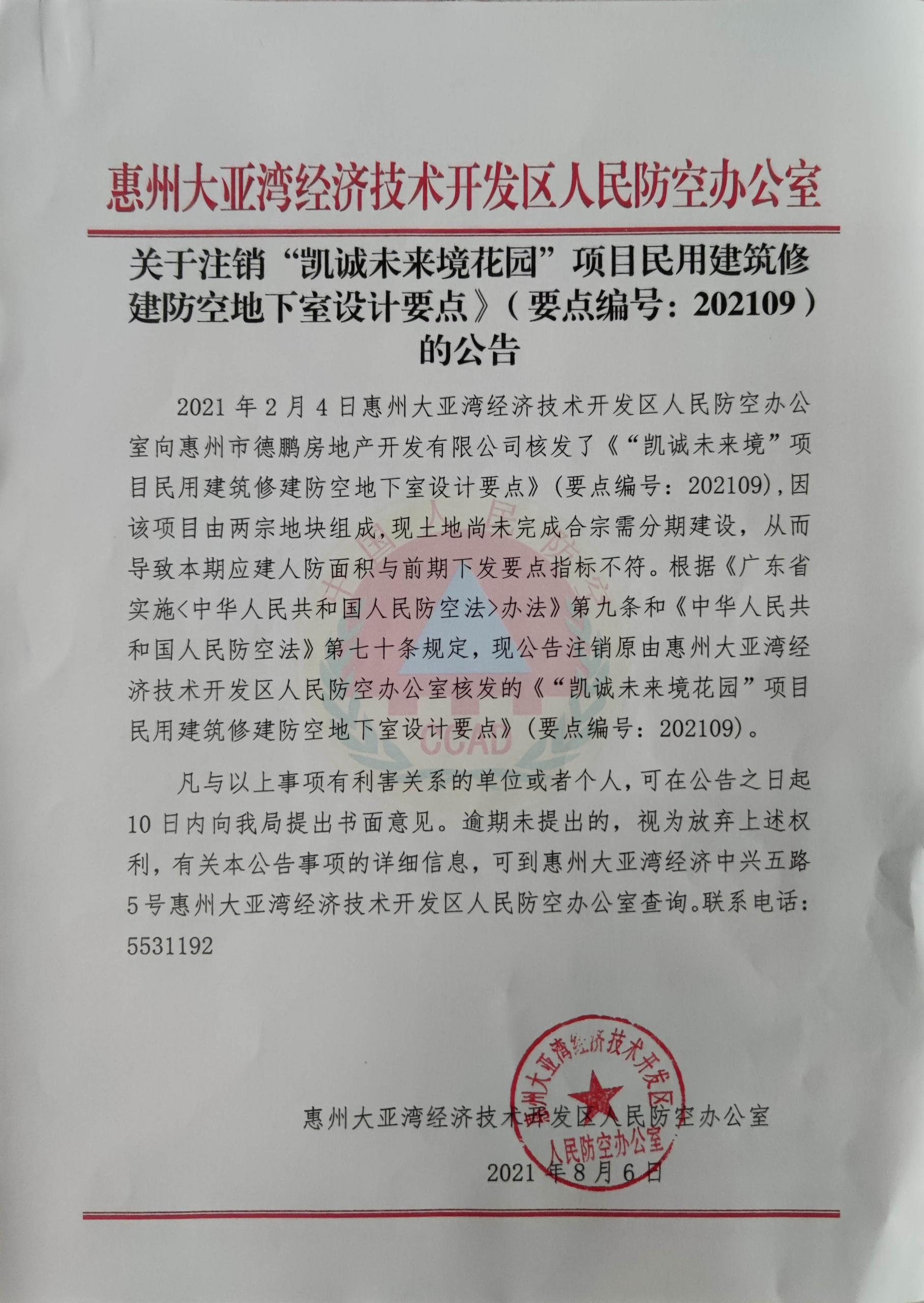 關于注銷《“凱誠未來境花園”項目民用建筑修建防空地下室設計要點》(要點編號:202109)的公告
