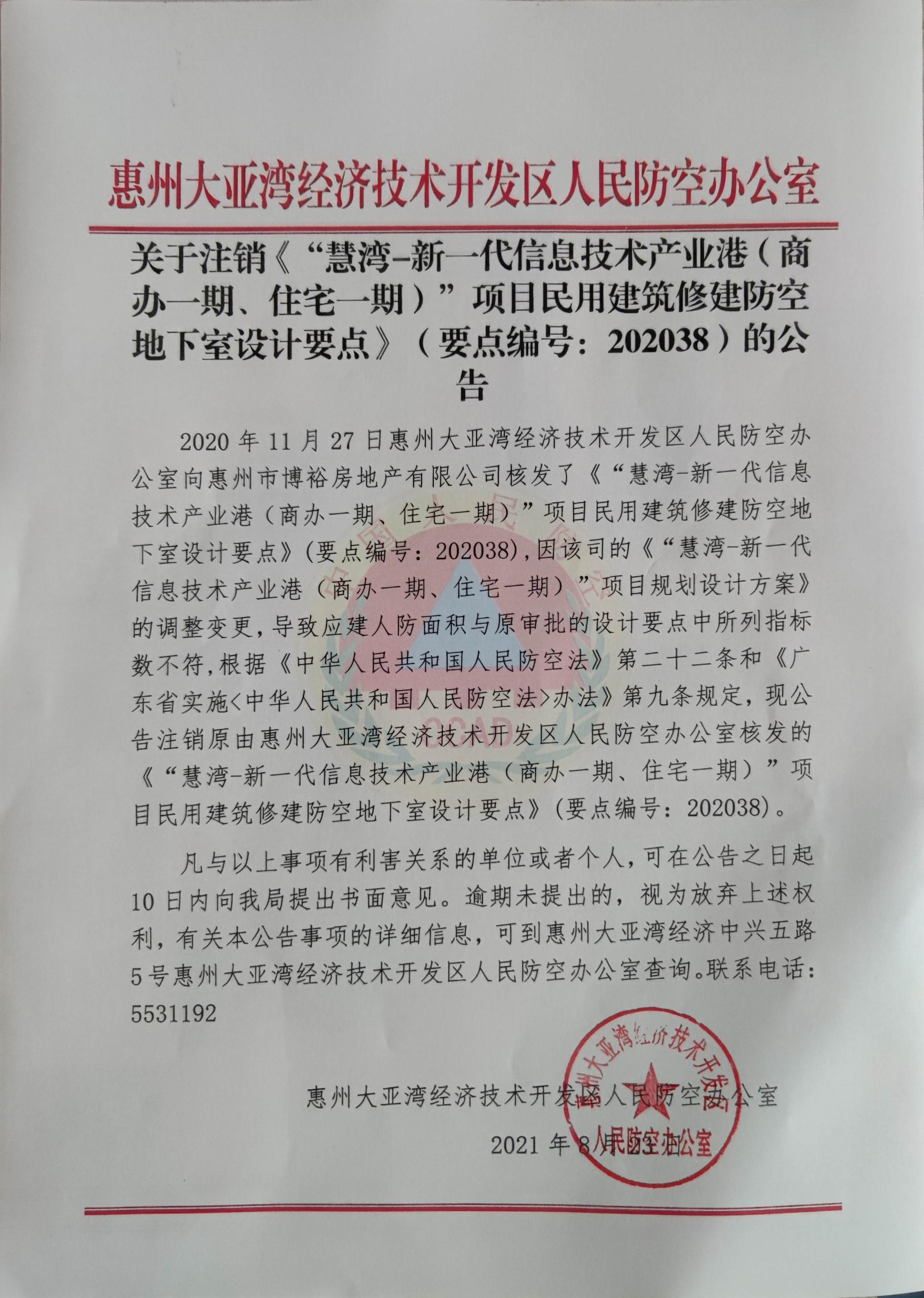 關(guān)于注銷《“惠灣-新一代信息技術(shù)產(chǎn)業(yè)港(商辦一期、住宅一期)”項目民用建筑修建防空地下室設(shè)計要點》(要點編號:202038)的公告