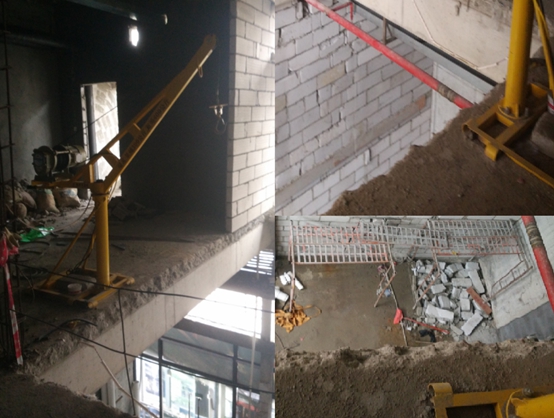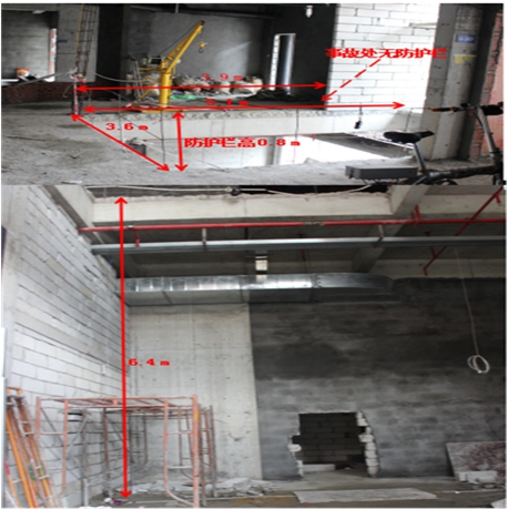 惠州大亞灣廚嫂當(dāng)家餐館位于西區(qū)街道龍海三路創(chuàng)新世紀(jì)城花園7棟G108-G109商鋪及二層大部分區(qū)域。為滿足餐館經(jīng)營需求,工程裝修將二層樓板(距一層地面層高6.4米)破開一長5.1米、寬3.6米的矩形樓層口用于增設(shè)樓梯。事故發(fā)生時(shí)矩形樓層開口已完成,并在樓層口的東邊、北邊設(shè)置了0.8米高的簡易鋼筋防護(hù)欄;西邊臨窗且砌有磚墻;南邊未安裝無防護(hù)欄,且邊緣放置了一臺(tái)多功能吊運(yùn)機(jī)用于從一樓地面吊運(yùn)裝修施工材料。(見圖一)現(xiàn)場勘察具體情況。