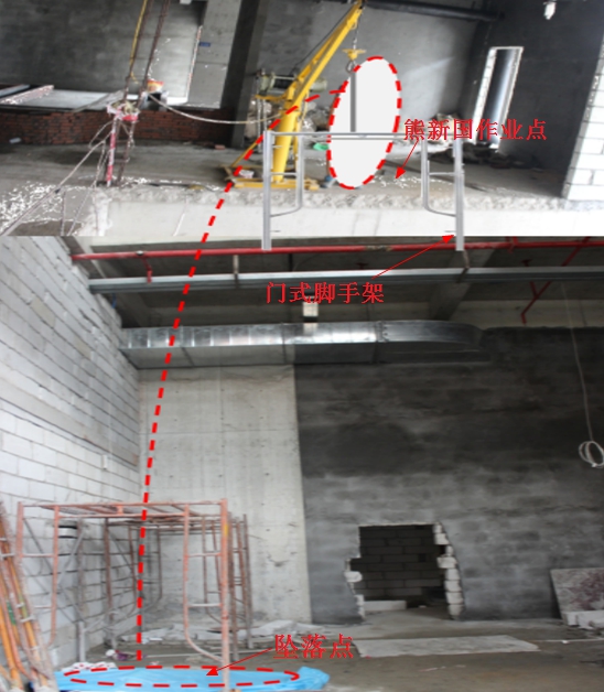 2017年6月16日上午10時(shí)20分許,首層G108-G109商鋪地面作業(yè)的工人劉厚春用繩子系好門式腳手架(兩品)掛上吊鉤后,二樓作業(yè)的工人熊新國站在樓層口邊緣操作多功能吊運(yùn)機(jī)將門式腳手架從一樓吊運(yùn)至二樓。當(dāng)?shù)蹉^上升至二樓時(shí),熊新國急于伸手去拉門式腳手架,由于距離較遠(yuǎn),手夠不著,于是將身體微斜探出二樓層口然后伸手去拉,此時(shí)因身體重心失穩(wěn)墜落至一樓地面。墜落過程見(示意圖三)