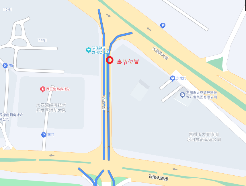 事發(fā)位置位于惠州大亞灣經(jīng)濟(jì)技術(shù)開發(fā)區(qū)西區(qū)街道龍山十路市政道路工地內(nèi),大亞灣大道至石化大道段的東側(cè)(區(qū)消防大隊旁)(見圖1)。