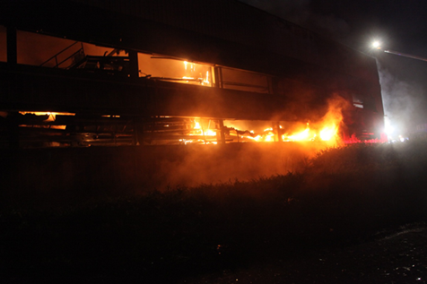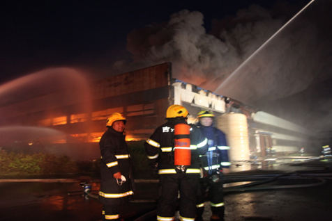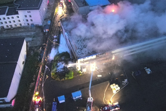 2時(shí)25分,主戰(zhàn)二大隊(duì)到達(dá)現(xiàn)場后,立即展開火場偵察,發(fā)現(xiàn)起火廠房內(nèi)生產(chǎn)設(shè)備已發(fā)生多次爆炸,火勢(shì)處于猛烈燃燒階段,過火面積約200平方米,并伴有大量濃煙,因爆炸導(dǎo)致廠房西南側(cè)坍塌。裝置內(nèi)有丙烯腈、甲苯、甲醇、五氯化磷等化工原料。指揮員根據(jù)現(xiàn)場偵察情況,迅速制定滅火方案,采取逐段噴水降溫控制火勢(shì)、泡沫滅火的戰(zhàn)術(shù)進(jìn)行撲救。經(jīng)過1個(gè)多小時(shí)奮戰(zhàn),3時(shí)45分,現(xiàn)場明火被撲滅,確認(rèn)無復(fù)燃跡象。