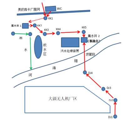 事故現(xiàn)場及污水管網(wǎng)平面示意圖如下: