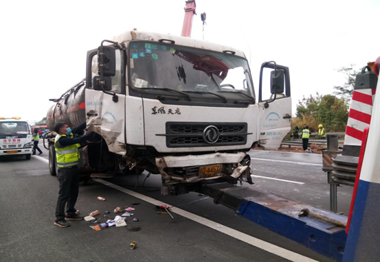 2019年12月30日09點(diǎn)57分,惠州隊(duì)接到報(bào)警調(diào)度。位于廣東省惠州市惠陽區(qū)潮莞高速公路良井服務(wù)區(qū)附近,一輛載約11噸硝酸的槽罐車突發(fā)事故側(cè)翻在高速路上,車頭陷入高速內(nèi)道防護(hù)欄內(nèi),車頭橫攔于高速上(事故未造成人員傷亡)?;葜蓐?duì)派出由副隊(duì)長陽燕輝、副隊(duì)長李榮華、專家組在內(nèi)15人組成的應(yīng)急救援分隊(duì)立即趕往事故現(xiàn)場。10點(diǎn)50分到達(dá)事故現(xiàn)場,指揮員陽燕輝在現(xiàn)場指揮部了解基本事故情況、作戰(zhàn)情況和現(xiàn)場情況后,隨即派出偵檢小組、堵漏小組,對(duì)事故現(xiàn)場及側(cè)翻槽罐車進(jìn)行現(xiàn)場偵檢和現(xiàn)場監(jiān)控等作業(yè)。并將實(shí)時(shí)監(jiān)控的現(xiàn)場數(shù)據(jù)及時(shí)上報(bào)現(xiàn)場指揮部,為指揮部現(xiàn)場救援方案的決定和實(shí)施提供了有效的幫助和技術(shù)支撐。在經(jīng)過長達(dá)5個(gè)小時(shí)的緊張?zhí)幹煤?,最終側(cè)翻的事故槽罐車于下午14點(diǎn)05分安全吊裝轉(zhuǎn)移,此次?;返缆愤\(yùn)輸搶險(xiǎn)救援工作宣告結(jié)束。14點(diǎn)10分惠州隊(duì)再次偵檢確認(rèn)現(xiàn)場情況安全與隊(duì)伍情況完好后將隊(duì)伍帶回。