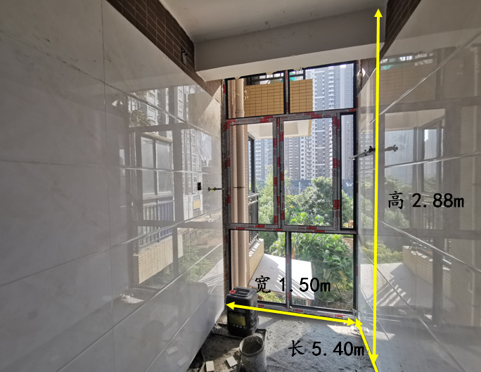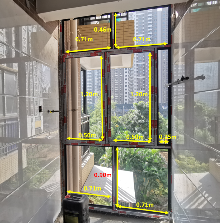 經(jīng)現(xiàn)場(chǎng)勘查,潤(rùn)豐居小區(qū)403房廚房整體長(zhǎng)5.40m,寬1.50m,高2.88m(見圖2)。廚房目前正在裝修,立面墻壁瓷磚鋪貼已完成90%,地面未施工;廚房南側(cè)臨邊處采用鋁合金窗封閉,目前窗戶未安裝玻璃,窗戶下層為兩開口結(jié)構(gòu),窗口高約0.90m,寬約0.71m;中層為三開口結(jié)構(gòu),窗口高約1.20m,從左到右寬度分別約為0.51m、0.51m、0.25m;上層為兩開口結(jié)構(gòu),窗口高約0.46m,寬約0.71m(見圖3)。