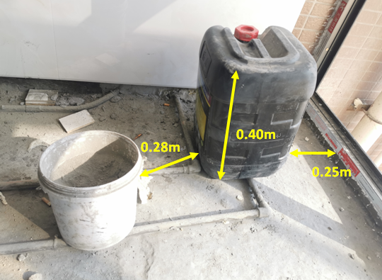 經(jīng)現(xiàn)場(chǎng)勘查,廚房東南角有一放置在地面水管上的涂料桶,桶高約0.40m,桶邊距廚房窗邊約0.25m,桶底部不穩(wěn);涂料桶西正北側(cè)約0.28m處有一裝有水泥的塑料桶(見圖4)。涂料桶正前方墻面瓷磚上有未擦凈的水泥痕跡,右側(cè)鋁合金窗第二層橫梁上有一散落狀水泥痕跡(見圖五)。