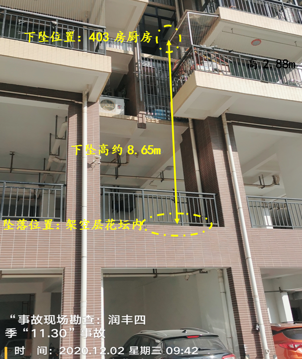 經(jīng)現(xiàn)場(chǎng)勘查,當(dāng)事人自潤(rùn)豐居小區(qū)403房廚房下墜至1棟2單元架空層花壇內(nèi),下墜高度約8.65m(見圖6)。