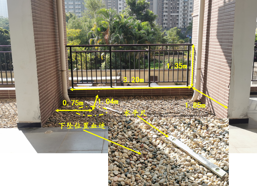經(jīng)現(xiàn)場(chǎng)勘查,當(dāng)事人墜落位置位于1棟2單元架空層花壇內(nèi)?;▔瘜捈s1.85m,長(zhǎng)約3.20m,花壇欄桿高約1.35m?;▔孛驿佊轩Z卵石,地面左前方有一攤血跡,血跡距左側(cè)墻面約0.75m,距花壇邊約1.04m,血跡旁有一水平尺,水平尺上有水泥痕跡。(見圖7)。