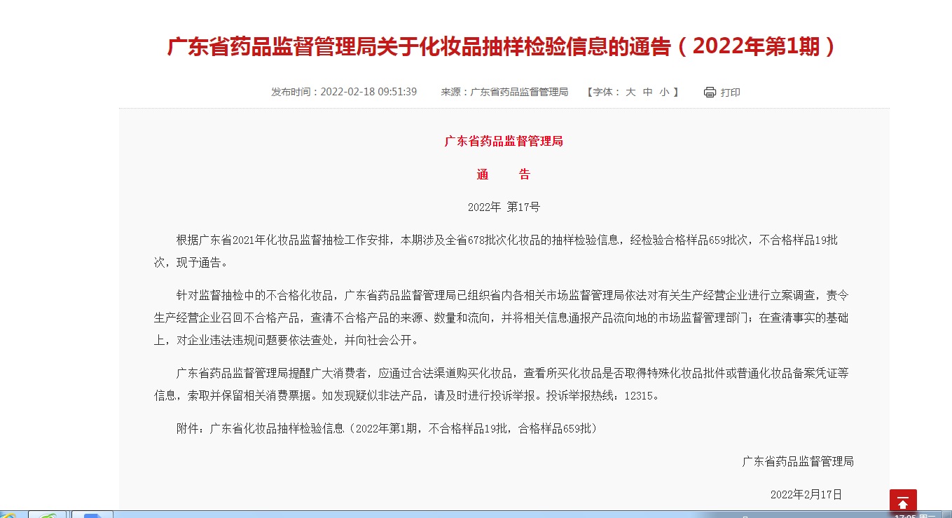 廣東省藥品監(jiān)督管理局關于化妝品抽樣檢驗信息的通告(2022年第1期)http://mpa.gd.gov.cn/zwgk/jgsz/jcj/cjxx/hzp/content/post_3816251.html