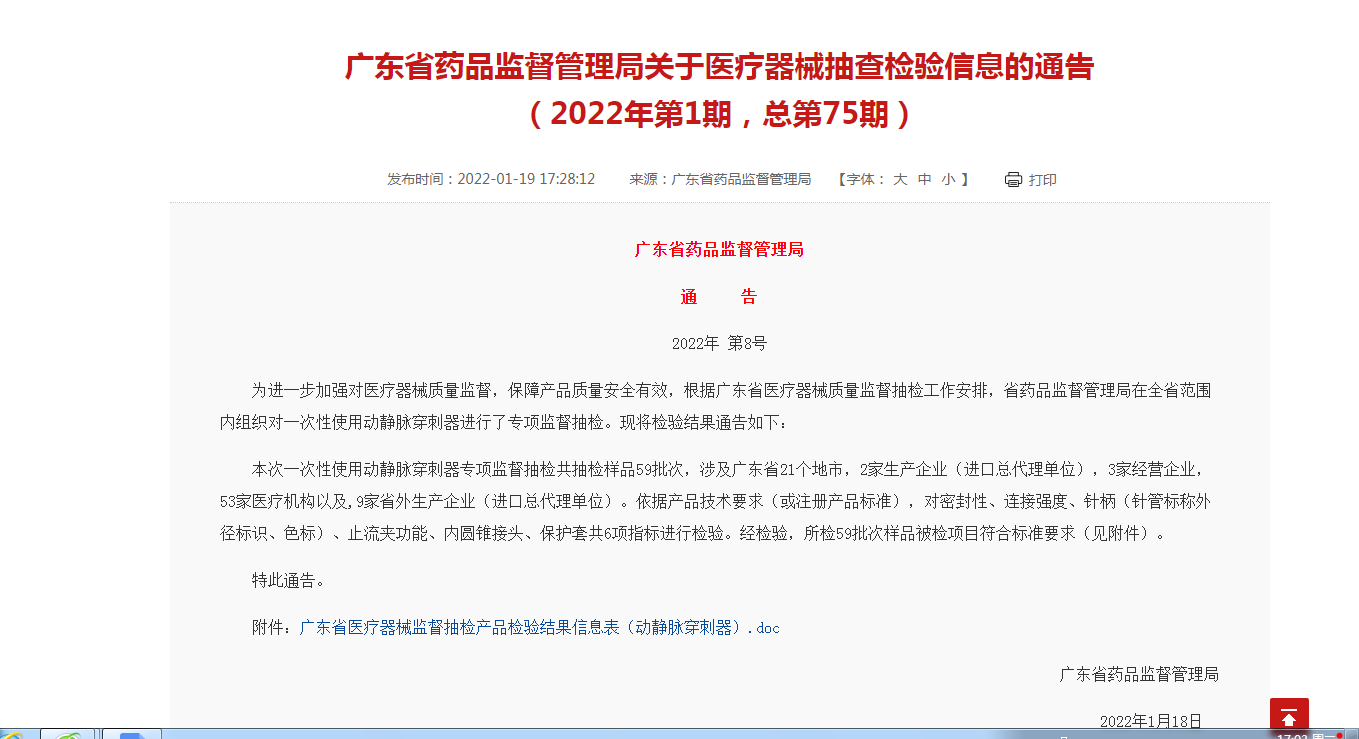 廣東省藥品監(jiān)督管理局關于醫(yī)療器械抽查檢驗信息的通告<br/>(2022年第1期,總第75期)http://mpa.gd.gov.cn/zwgk/jgsz/jcj/cjxx/qita/content/post_3767823.html
