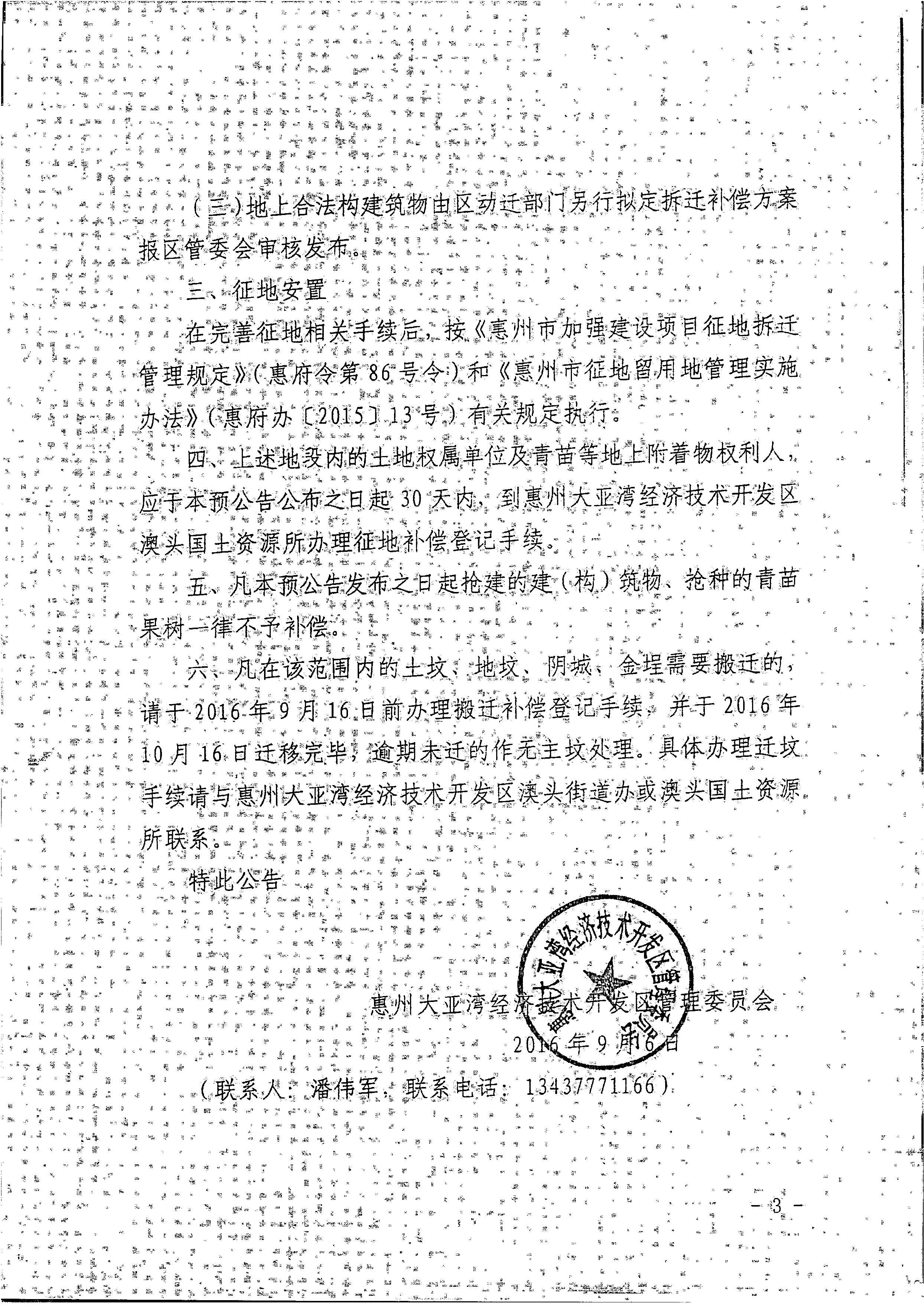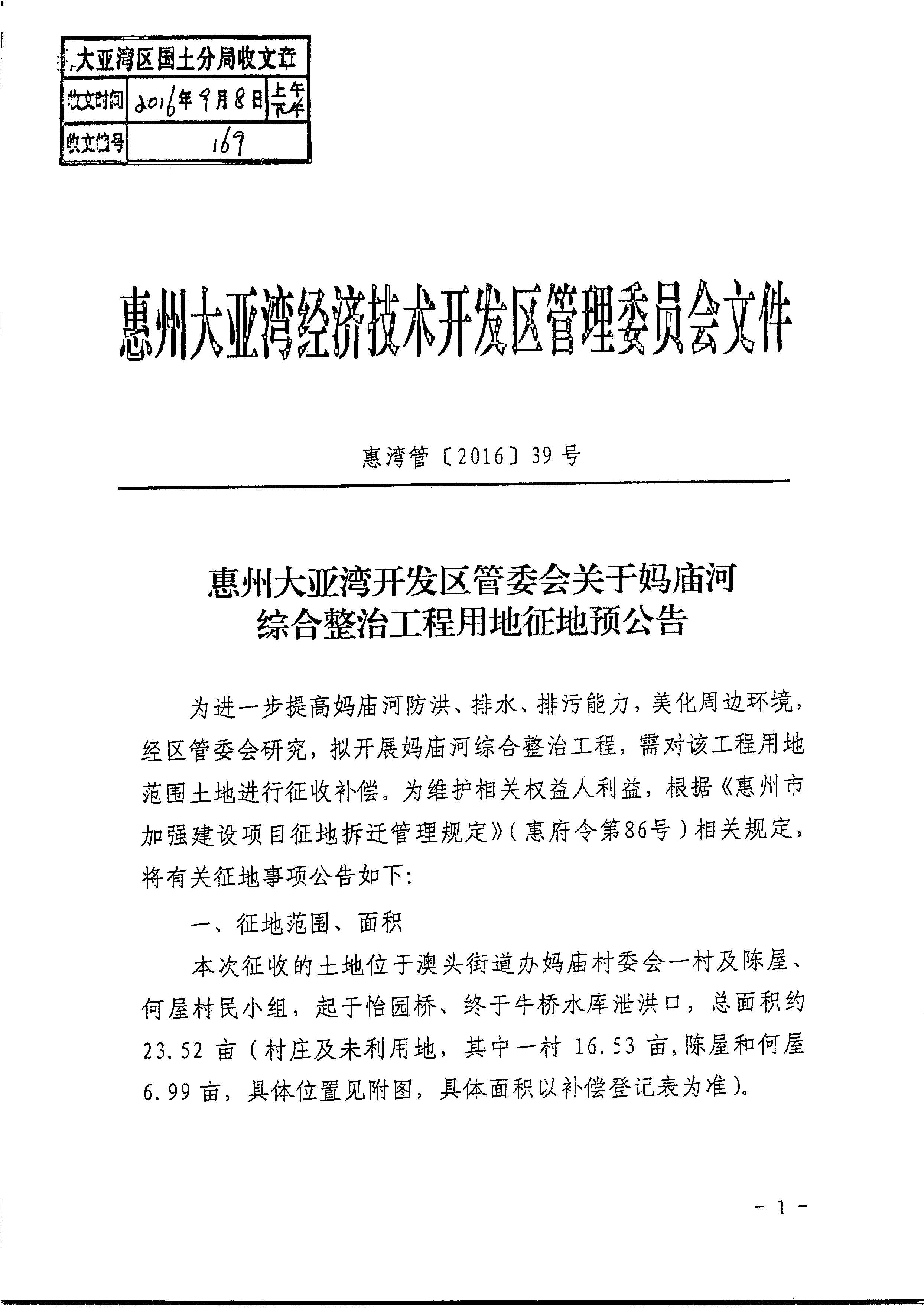 惠州大亞灣開發(fā)區(qū)管委會(huì)關(guān)于媽廟河綜合整治工程用地征地預(yù)公告.pdf