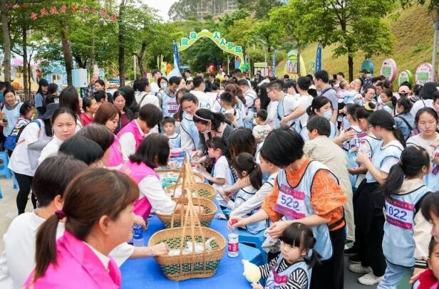 本場親子趣味馬拉松,全程設置了六個必經(jīng)打卡點、四個自選趣味游戲,運動員們需要依次到達并集齊六個印章,才能在終點處兌換小禮品。在終點處設有非物質(zhì)文化遺產(chǎn)項目《西區(qū)客家艾粄制作技藝》,小朋友與家長們紛紛上前嘗試制作、品嘗美味的艾粄。