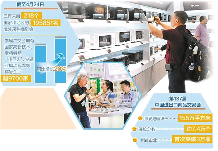 “第二期參展商品的‘含新量、含綠量’持續(xù)提升,廣受國際市場歡迎。截至4月24日,已有來自218個國家和地區(qū)的195851名境外采購商到會。廣交會上的旺盛人氣和踴躍洽談場面,充分體現(xiàn)了全球工商界對中國經(jīng)濟前景的信心。”商務部新聞發(fā)言人何亞東說。