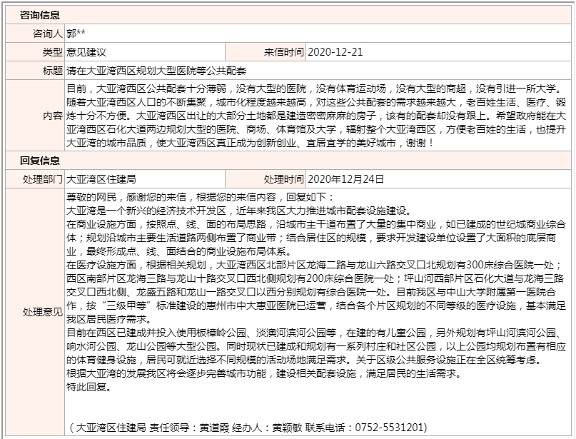 關(guān)于在大亞灣西區(qū)規(guī)劃大型醫(yī)院等公共配套的問題