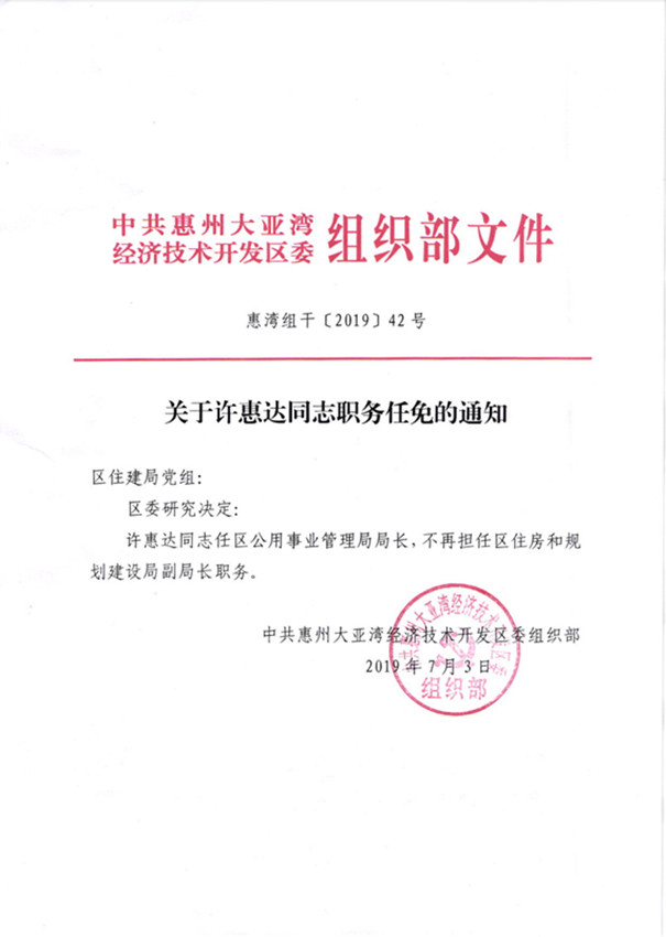 關(guān)于許惠達同志職務(wù)作免的通知