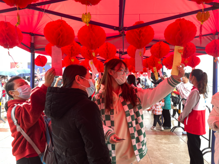 漁歌表演環(huán)節(jié)暫告一段落,豐富的游園活動吸引了眾多市民打卡玩耍,現(xiàn)場除了有經典的游園游戲套圈圈、投壺外,還少不了元宵佳節(jié)的傳統(tǒng)活動——猜燈謎?!霸?jié)后捷報多(打一成語)”“四四方方小家伙 上面擺著串串珠(打一文具)”……一條條寫滿節(jié)日祝福和充滿智慧幽默的燈謎受到市民的熱捧,大家對著燈謎或苦思冥想,或熱烈討論,猜中的歡呼雀躍,沒猜中的也豁然開朗地大笑起來,現(xiàn)場一片歡樂祥和的氣氛。